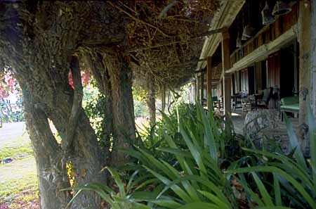 Along the edge of the verandah is a rustic pergola covered with bougainvillea. This filters and softens the light on the verandah and makes a veil through which you see the garden and the lagoon.