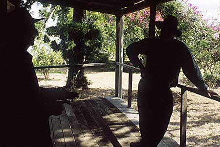 Jim Archer (left) and Thom Blake, talking on the verandah of the detached guests' quarters.