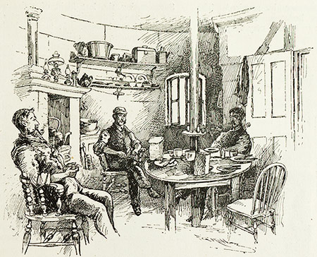 An after-dinner chat, pen and ink drawing by F G Kitton, letterpress printed from a photo-engraved line block.