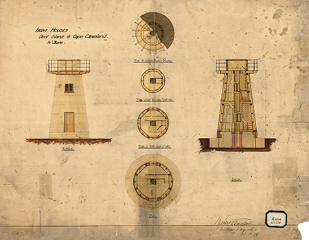 Light houses: Dent Island & Cape Cleveland, a contract drawing prepared in the office of the Colonial Architect. In 1878 the contractor William Clark signed the drawing in the bottom right corner, but part of his signature has been lost. (Source: National Archives of Australia, series J2775, item 1717459).